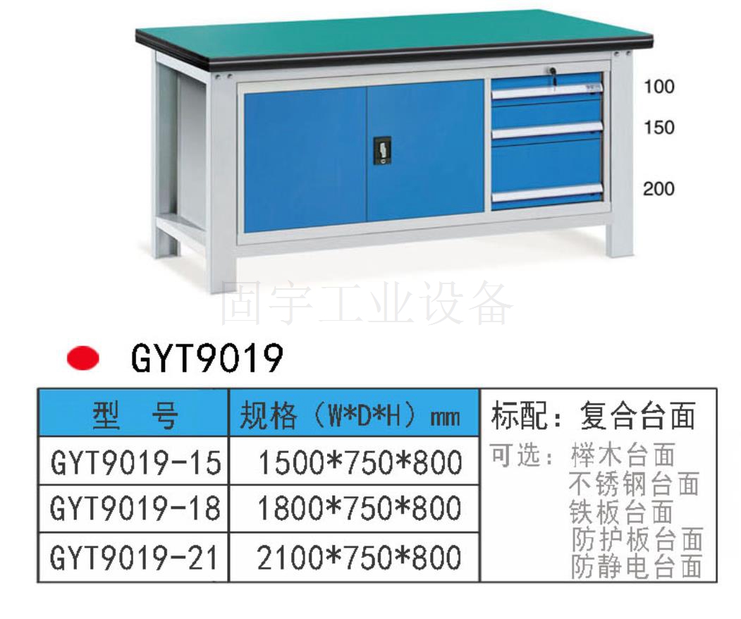 工作臺采用優質冷扎板精工制作而成,堅固的工作桌框架,牢固平穩,可使工作桌承重1000kg;多種工作桌面選擇,可配合不同使用的要求;工具吊柜(箱),側柜(箱)燈架,調節腳杯,,外形美觀;層板,抽屜質量上乘,承重大,抽屜內可根據需要任意分隔;節約空間,適用性強。 范圍 工作臺適合于模具、鉗工、檢測、維修、組裝等各種不同應用場合,具有良好的耐腐蝕性,耐臟性,抗沖擊性和承重能力強。桌面經特殊處理,具有防腐、抗沖擊力強等特點,多種桌面的選擇,可配合不同的使用要求;所配置的抽屜、柜門方便使用者存儲工具;桌角上預留電源孔,方便安裝電源插座。工作臺(桌)分為輕型(可承重300公斤),中型和重型工作臺(桌)可承重1000公斤及特制的工作臺。可根據需要靈活地配置各種吊柜、單柜、雙柜等,可加裝掛板,電器板,燈頂板、調節腳杯,輪子,擱板等桌上部件,具有多種選擇,能夠滿足各種工位的需求。 工作臺材質采用優質冷軋鋼板,表面采用靜電噴涂處理而制成,堅固的工作桌框架,牢固平穩,可使工作桌臺面均勻承重達到1000kg。桌面有多種材質組成,適用于各行業辦公場所。可配合工具柜,吊柜,掛板,單開門柜使用。抽屜、承辦承重大,性能好,抽屜里可根據需求配置分隔條 工作臺分類:根據臺面的不同分為:櫸木工作臺、鋼板合成工作臺、防靜電工作臺、高分子工作臺;根據承重的不同分為:輕型工作臺、中型工作臺、承重型工作臺;根據功能的不同分為:多功能工作臺、帶吊柜工作臺等等。 臺面優勢 復合臺面特性臺面平整度高,撓曲度為0.8mm。表面2mm厚度為高分子材料,使臺面耐酸堿、耐磨、耐油。臺面采用高壓纖維板,使臺面更具有抗沖擊性。特別的圓弧桌角,不易受撞擊損壞。高強度塑膠包邊堅固、實用、不易損壞、不易脫落。櫸木桌面特性桌板使用櫸木與防水膠經加壓制造而成。表面光滑平整,美觀不易變型,耐油、耐熱、耐酸、耐堿,適合一般工廠作業與精密模具維修,儀器置放與檢測等用途。不銹鋼包面特性桌板使用高壓合成板,表面包1-2mm砂面不銹鋼板,以達美觀耐用。耐高溫、耐磨損、耐油、使用壽命長,為多功能桌板,適合一般工廠、食品業、研究室、電子廠無塵室使用。輕型工作臺可承重300kg-500KG防火板臺面特性輕巧、美觀、耐磨、防火。層壓板臺面特性工作桌面平整,變型小,強度高,抗沖擊性好。 標準顏色 產品顏色 標準的顏色可分為6種:淺藍色(RAL5015), 電腦灰(RAL7035), 機床綠(RAL6011),深藍色(RAL5017)。